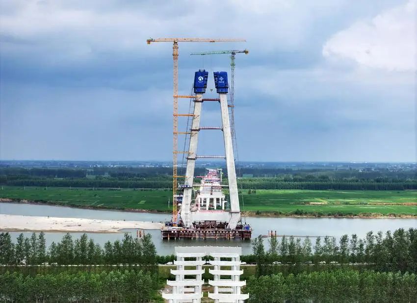 在武荆宜高速汉江特大桥施工现场,施工人员开始对这座国内最大的跨径无辅助墩组合梁独塔斜拉桥进行上塔柱施工,冲刺主塔封顶。上半年,该项目完成投资12.6亿元,占年度计划60%,超时序完成任务。