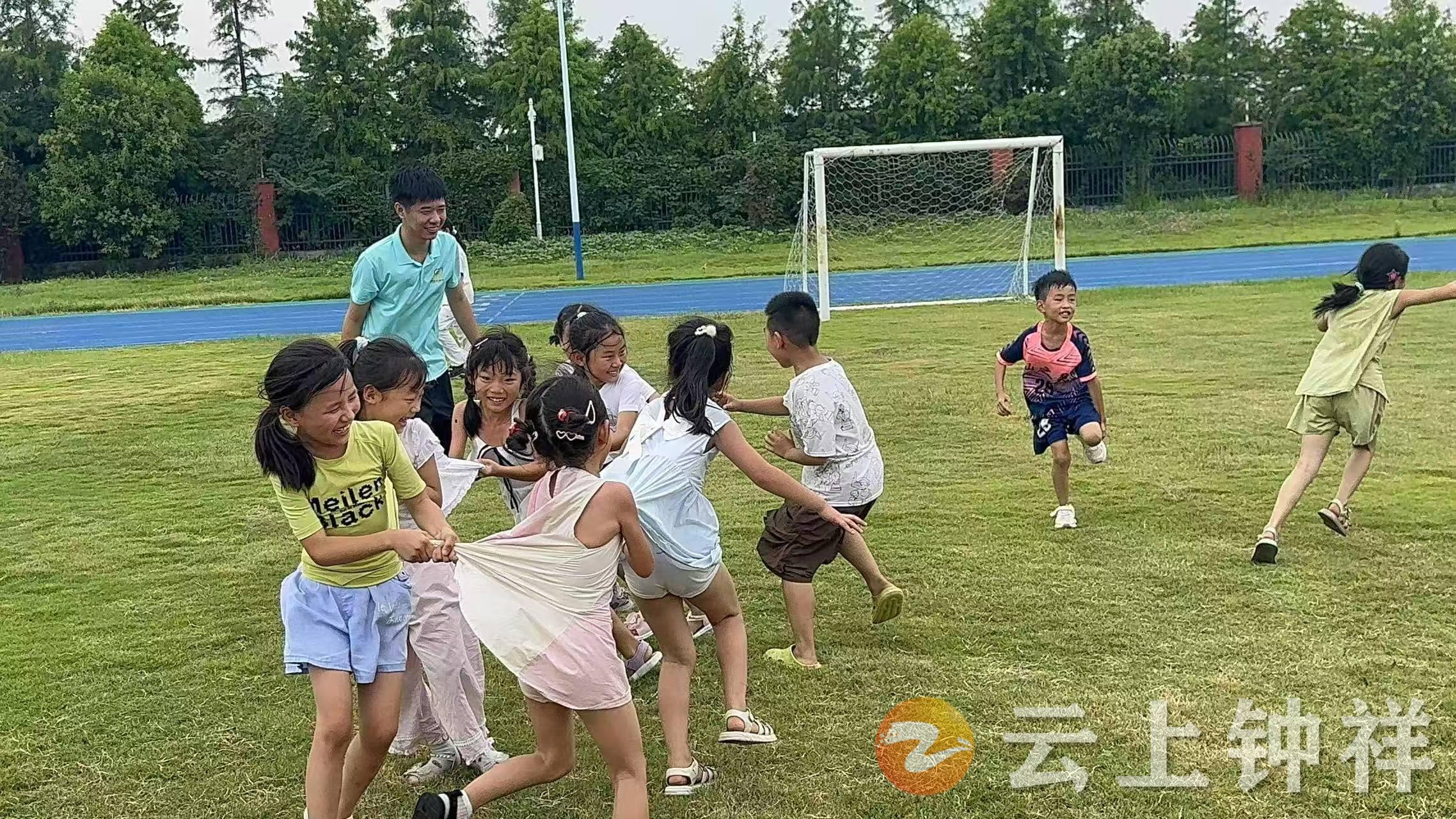 操场上,老师带着孩子们一起在游戏中锻炼身体。“别松手,抓紧啦”“快跑呀,老鹰来啦”一声声欢声笑语与运动鞋摩擦地面的“吱吱”声交织成夏日的活力乐章。