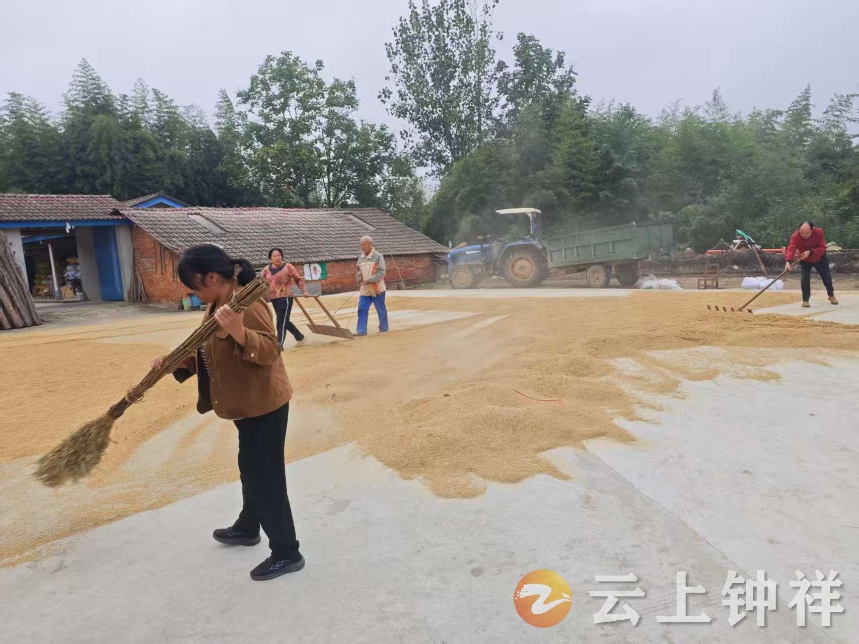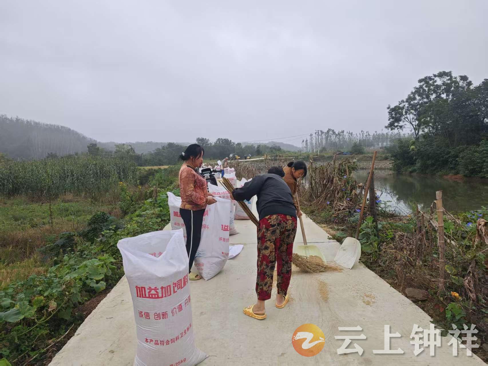 在李会英的招呼下,同住一网格的村民拿起家中的扫帚、铲谷工具一同来到路上,有的推扫稻谷、有的帮助装袋、有的扎绳子,还有的负责把装好袋的稻谷用车拉回去堆放好。大家分工明确、配合默契。尽管天空中还下着小雨,但大家没有丝毫怨言,一心只想尽快把稻谷收完,确保稻谷能进家门安全存放。
