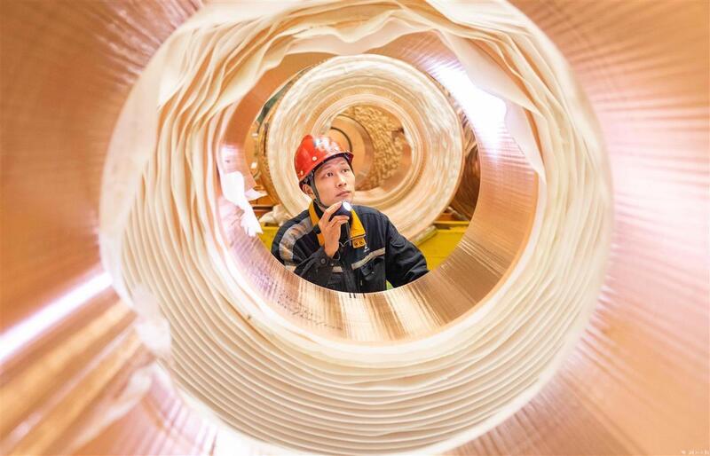 华中铜业员工正在仔细检查铜板带产品质量