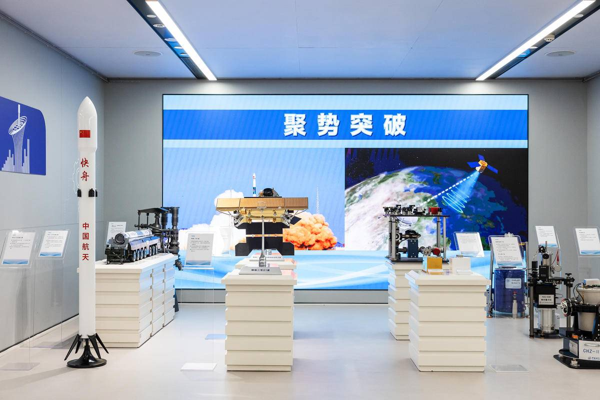 在武汉产业创新发展研究院展厅,展出珞珈二号01星模型和珞珈三号01星模型。(湖北日报全媒记者 任勇 摄)