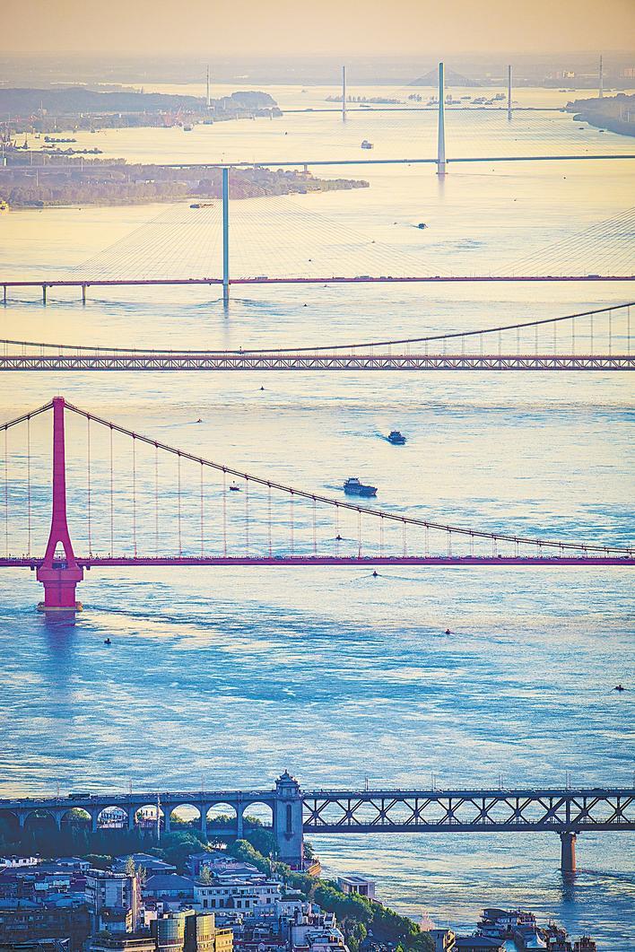 武汉晴空万里,能见度极高,在高处远眺,一眼可以看到六座长江大桥。 (湖北日报全媒记者 任勇 摄)