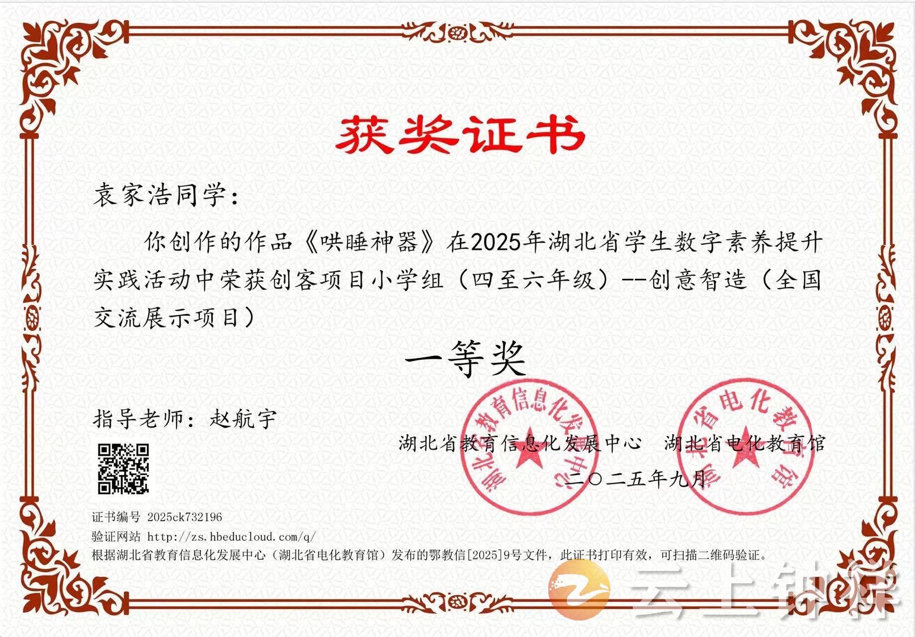 近日,2025年湖北省学生数字素养提升实践活动传来捷报,钟祥八中袁家浩同学的作品《哄睡神器》,在创客项目小学组“创意智造”全国交流展示项目中脱颖而出,斩获省级一等奖。
