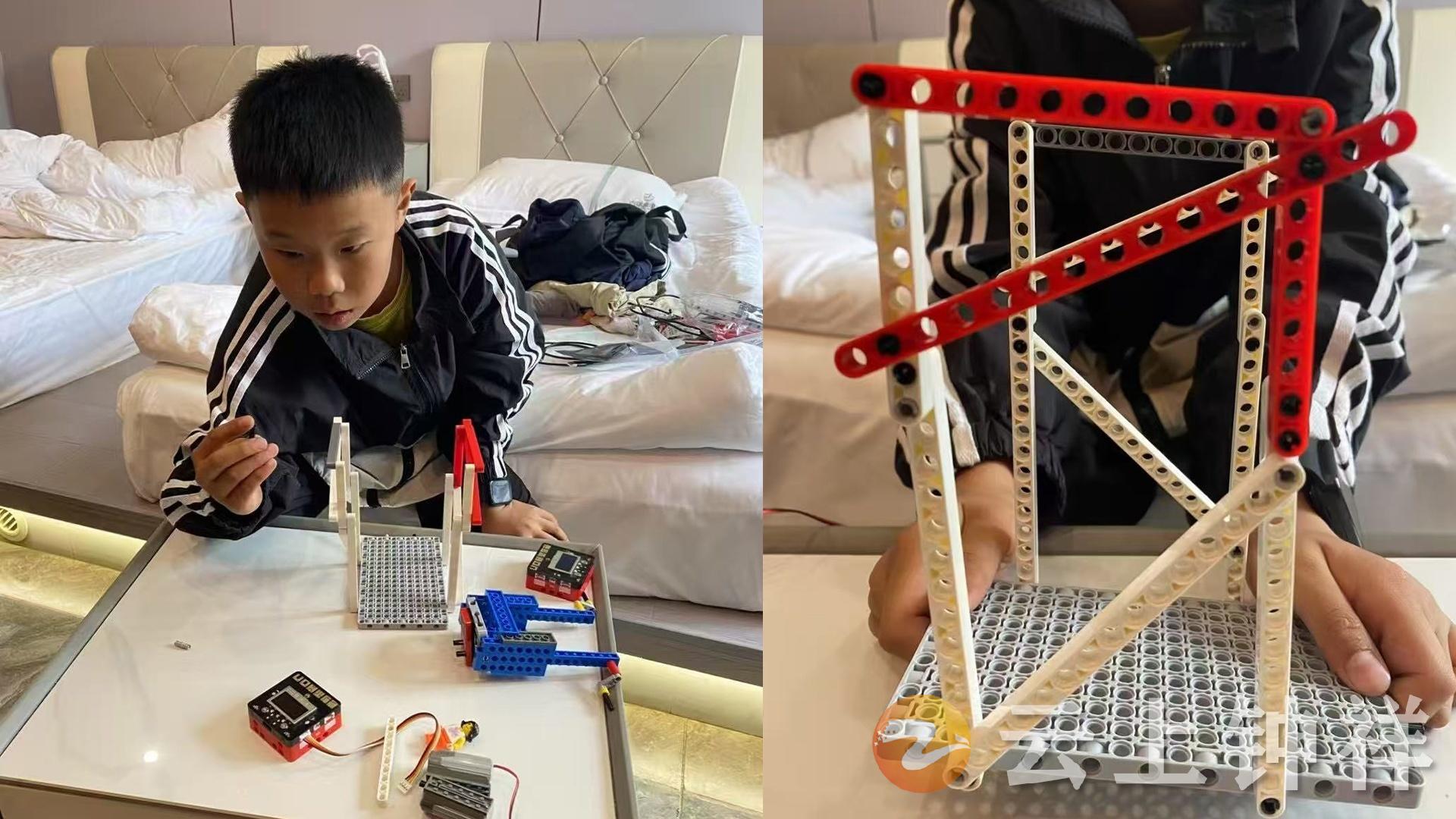 袁家浩的创作灵感源于生活观察,为缓解母亲哄弟弟入睡的辛劳,他将学科知识与数字技术相结合,打造出这款兼具实用性与人文温度的作品。该神器以乐高积木搭建框架,采用双马达驱动模拟轻柔晃动摇篮,设有三档速度调节功能;同时搭载麦克风哭声检测、湿度感应监测尿不湿状态模块,触发预警后可通过微信小程序向家长推送通知,实现“机械哄睡+智能看护”双重功能,还兼顾婴儿内耳前庭发育需求,细节设计贴心周到。从初稿到优化成型,袁家浩反复打磨迭代,用扎实的实操能力和新颖构思赢得了评委的认可。