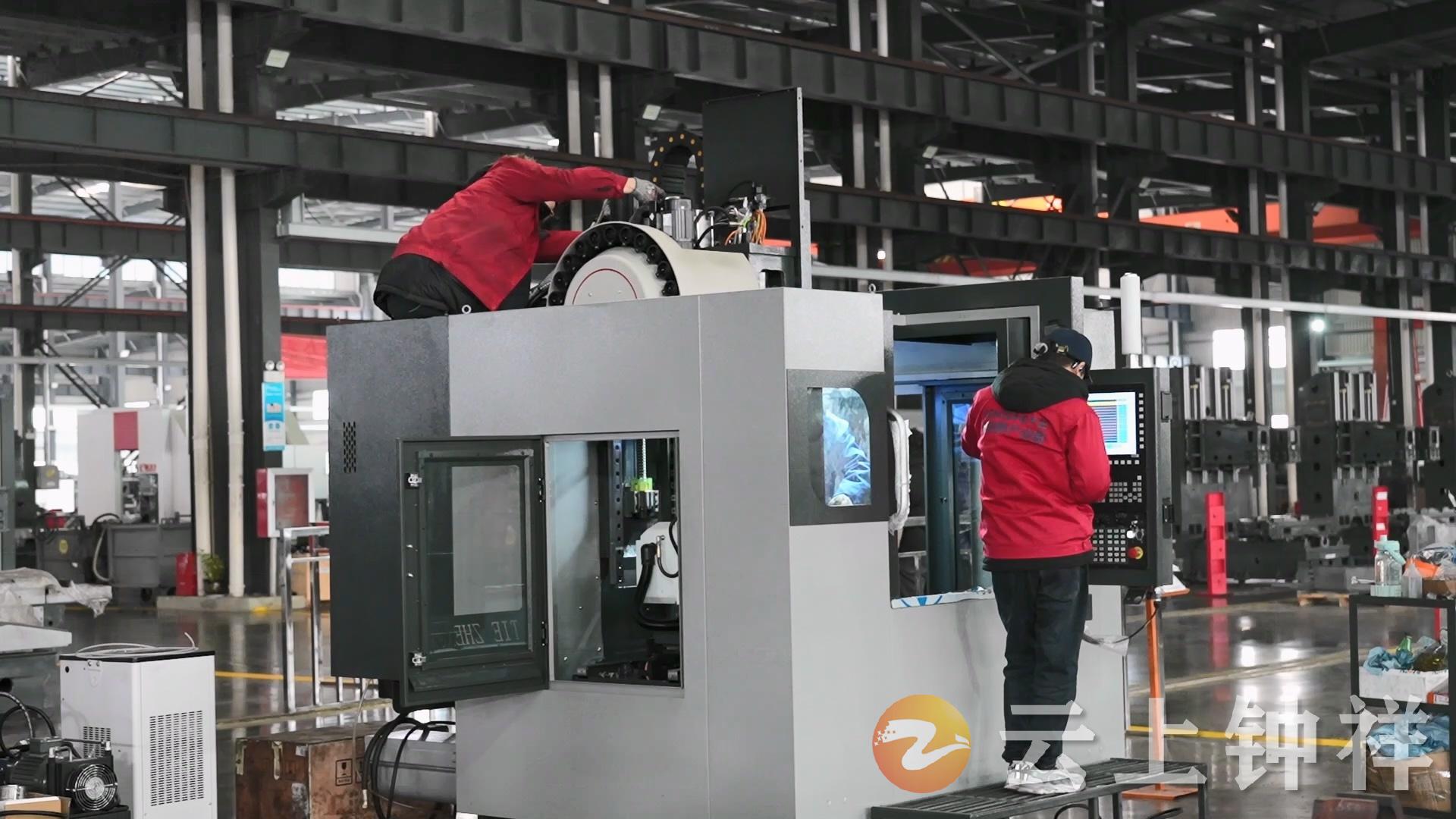 在园区现代化厂房内,生产线有序运转,工人们专注作业,新研发的五轴加工中心精密运转、火花轻溅,科技感十足。