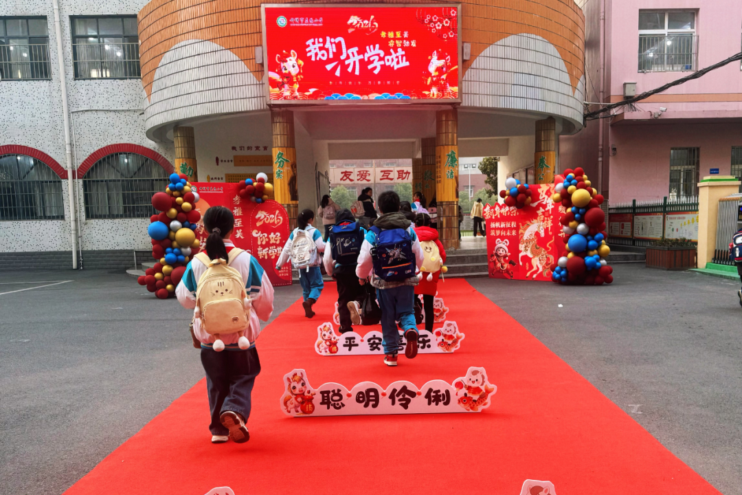 莫愁小学的开学仪式格外温馨。学校精心打造了以“马年启新”为主题的入校通道。色彩鲜艳的气球拱门、写满“平安喜乐”“聪明伶俐”等美好祝福的立牌,与电子屏上“我们开学啦”的醒目字样交相辉映。孩子们背着书包,踏着鲜红的地毯,依次跨越“智慧拱门”,在欢声笑语中步入校园,脸上写满了对新学期的憧憬与期待。