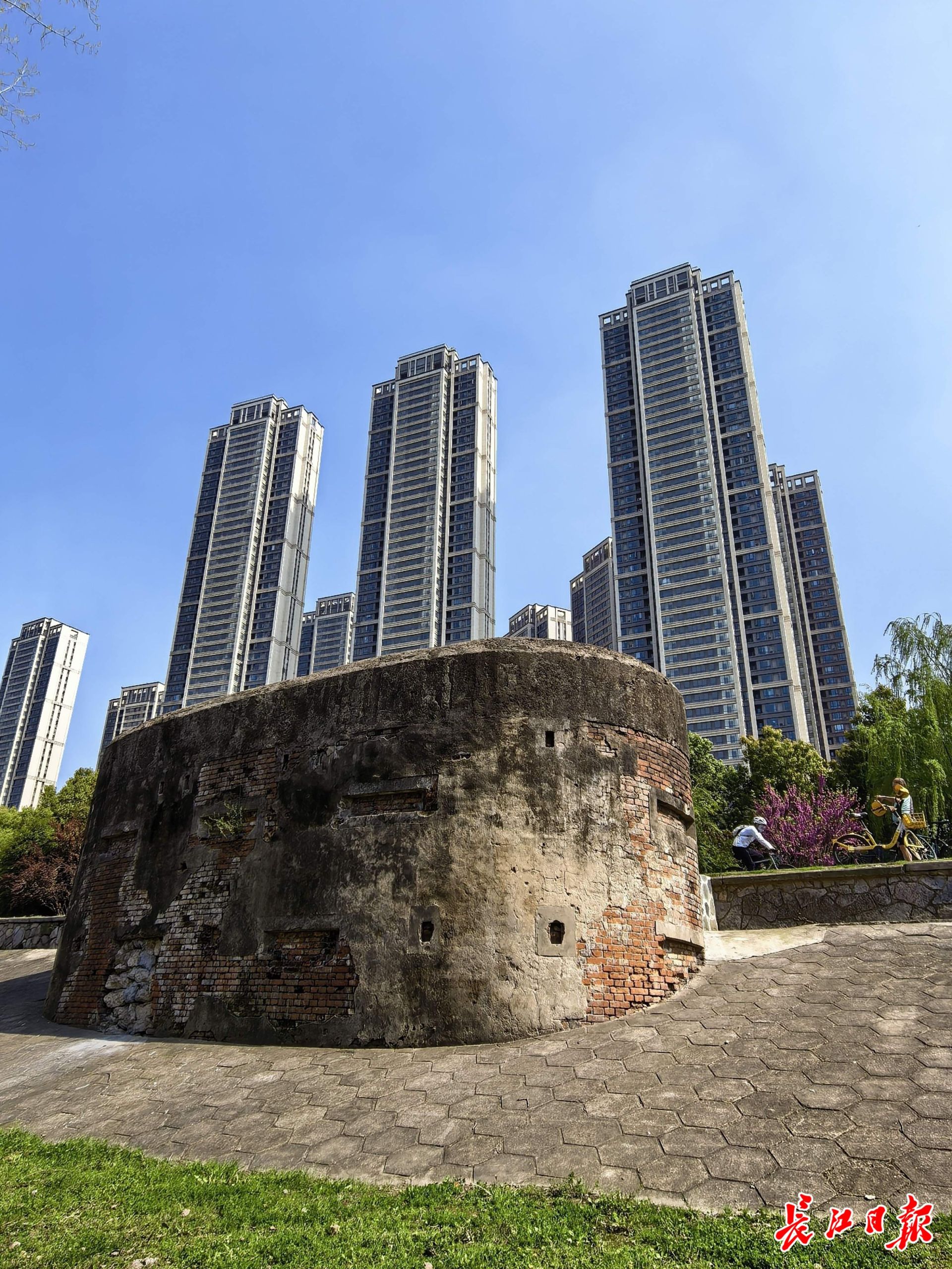4月1日,张公堤常青花园段,一座碉堡背后高楼林立。 记者孙笑天 摄