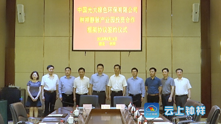 6月14号,钟祥市人民政府与中国光大绿色环保有限公司签订钟祥静脉产业园投资合作框架协议。市领导郭志泉、陈劲松参加签约仪式。