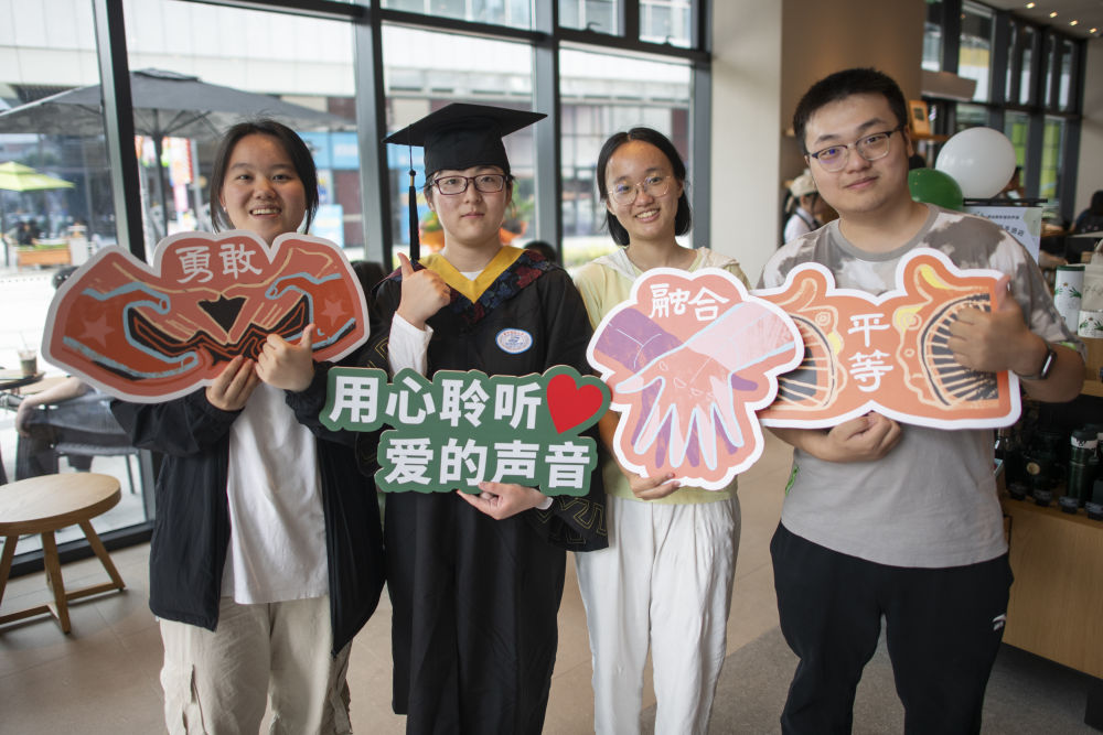 华中科技大学生物工程系毕业生窦凌云穿着学士服,拿着留言本,倒了三趟地铁、花了一个多小时赶来为自己的本科生涯画上句号。“我曾在学校手语协会担任主席,参加、组织过许多与聋哑人士相关的公益活动。快要离开武汉了,我希望尽己所能支持聋哑朋友们。他们大都善良、友好,希望他们能得到更多理解与帮助。”