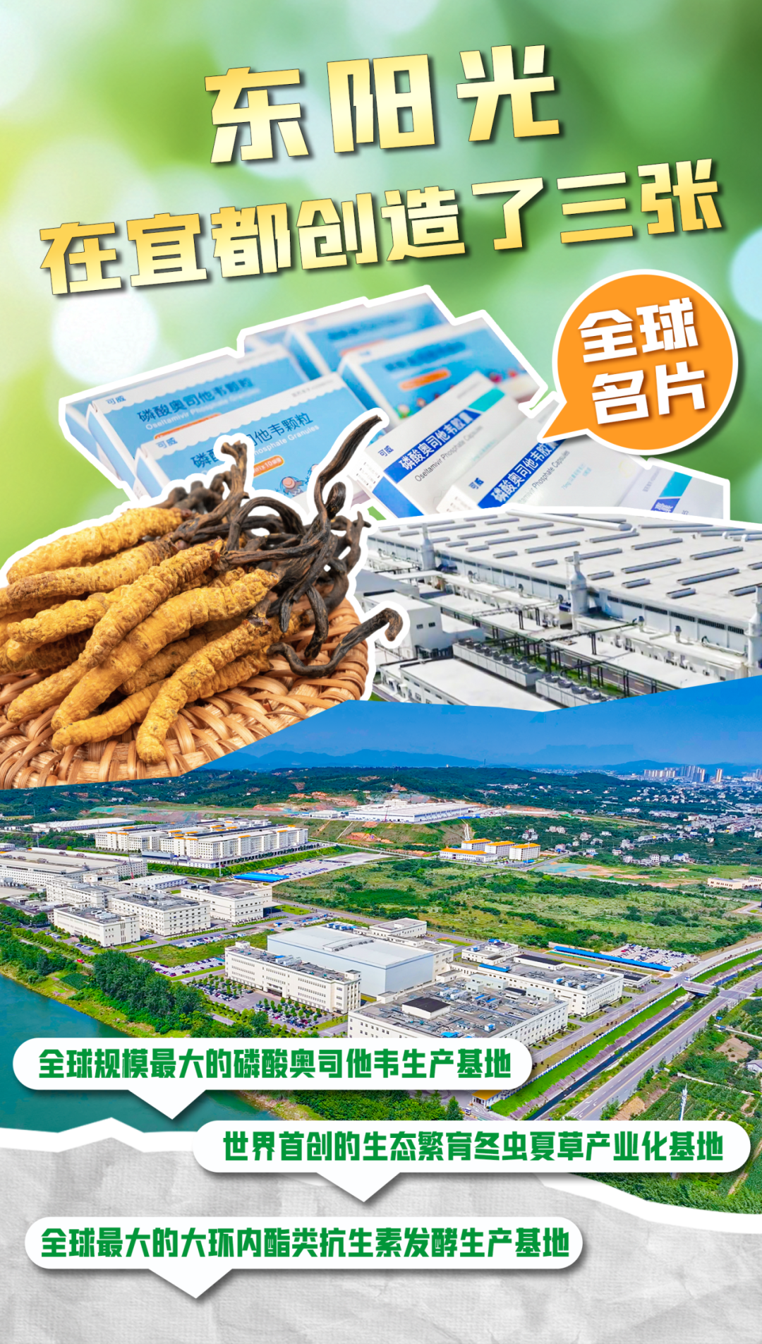 东阳光在宜都创造了三张“全球名片”——全球规模最大的磷酸奥司他韦生产基地、全球最大的大环内酯类抗生素发酵生产基地、世界首创的生态繁育冬虫夏草产业化基地。