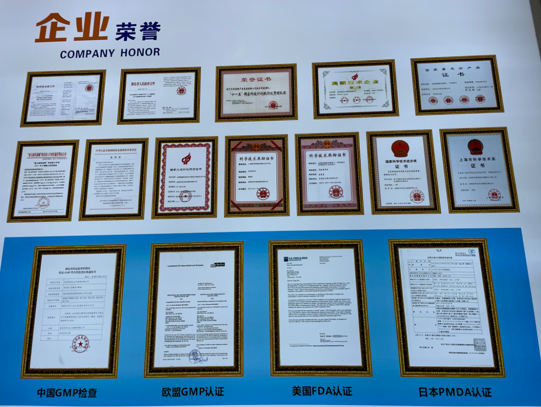 墙上,“中国、欧盟EDQM、美国FDA、世卫组织WHO”四重GMP认证分外醒目。