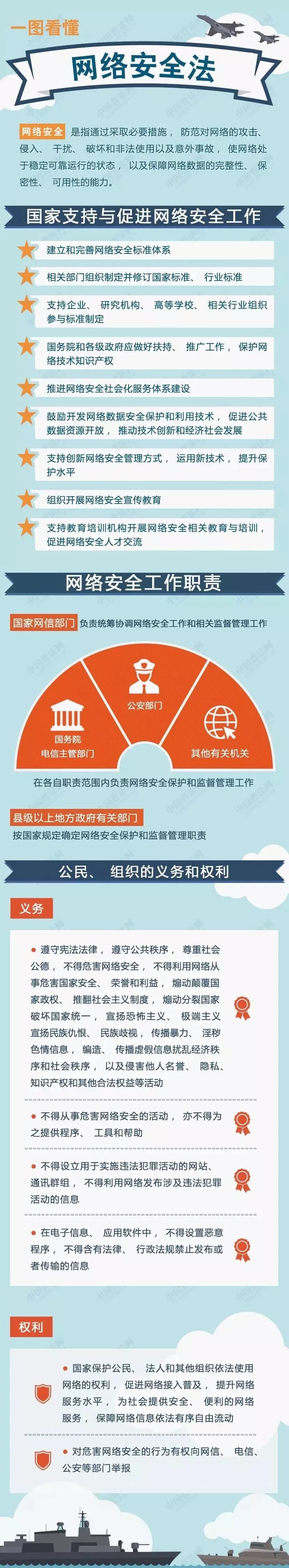 《中华人民共和国网络安全法》于2016年11月7日发布,自2017年6月1日起施行,是我国第一部全面规范网络空间安全管理方面的基础性法律。