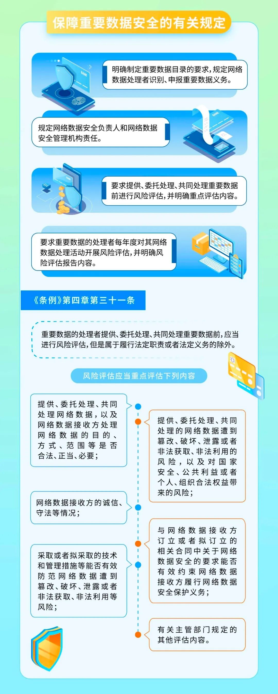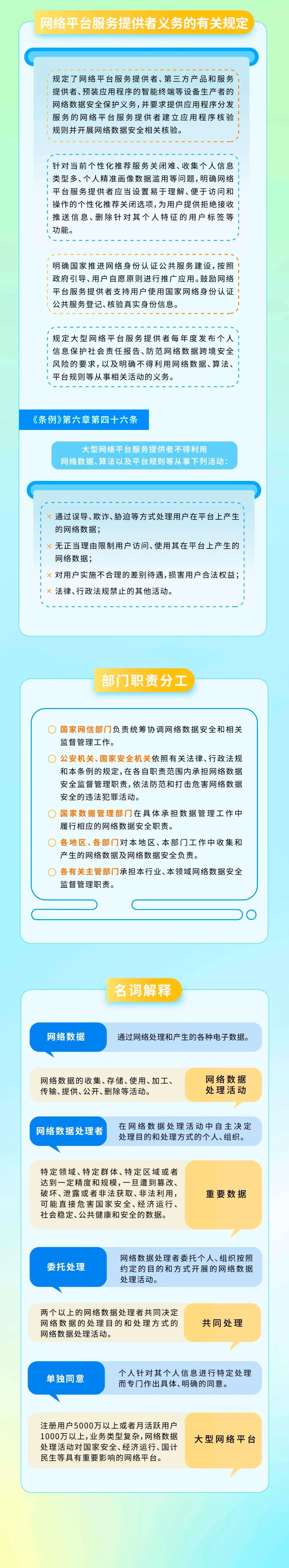 一图读懂《网络数据安全管理条例》 2025-04-15 11:05 0 《网络数据安全管理条例》(以下简称《条例》)自2025年1月1日起施行。《条例》的出台,标志着我国数据安全法规体系的进一步完善,对我国强化数据安全和个人信息保护、保障数据要素有序开发利用、促进数字经济健康有序发展意义重大。让我们和小安一起来学习《条例》的主要内容,进一步筑牢我国网络数据安全防线,以高水平安全护航网络强国建设。 来源:国家安全部微信公众号