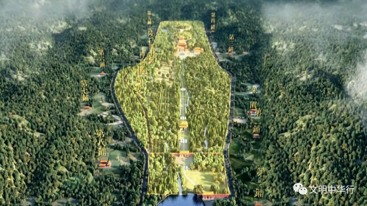 明显陵始建于公元1519年,迄于公元1559年,历时四十年建成。整座陵墓气势宏大,占地广阔,规模甚至超越了北京明十三陵的任何一座陵。明显陵由30余处规模宏大的建筑群组成,相互映衬,错落有致,如同“天造地设”,是建筑艺术与环境美学相结合的天才杰作。从上空俯视,整座显陵如一只巨大的“宝瓶”,内外罗城交相环绕,红墙黄瓦随山势起伏,山、水、林、木与建筑和谐分布,构成前朱雀、后玄武、左青龙、右白虎的风水格局。明显陵在陵区周围建有高墙,与陵宫区的围墙相对,分别称为外罗城和内罗城。这样的形制也被后代的帝王模仿,形成了独特的帝陵制度。