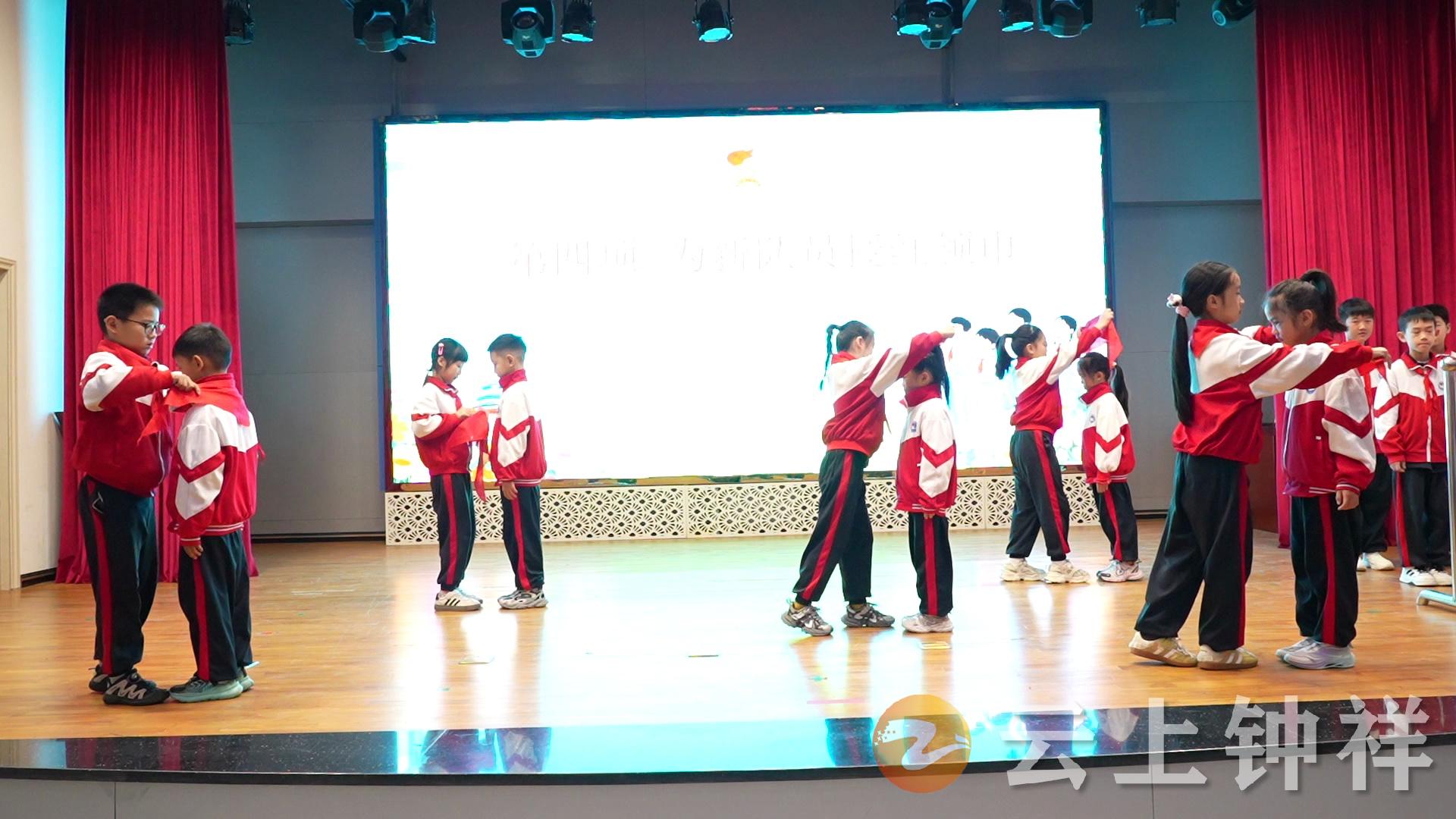 “强国复兴有我 争当新时代好少年”,主题队日示范活动在激昂的《出旗曲》中开始,全体少先队员高唱《中国少年先锋队队歌》。老队员为新队员授戴鲜艳的红领巾,象征着少先队组织的传承。新队员在队旗下高举右拳,庄严宣誓,铿锵的誓言表达了他们为共产主义事业贡献力量的决心。