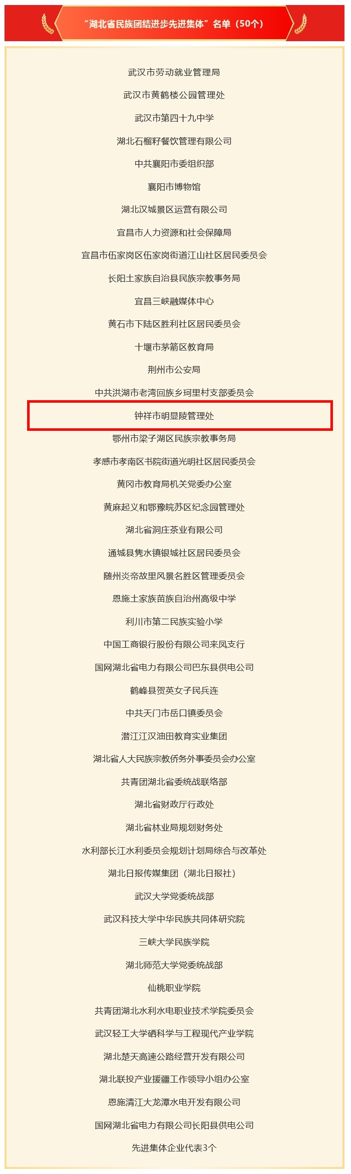 近日,省委、省政府正式公布“湖北省民族团结进步先进集体”表彰名单。其中,钟祥市明显陵管理处光荣上榜。