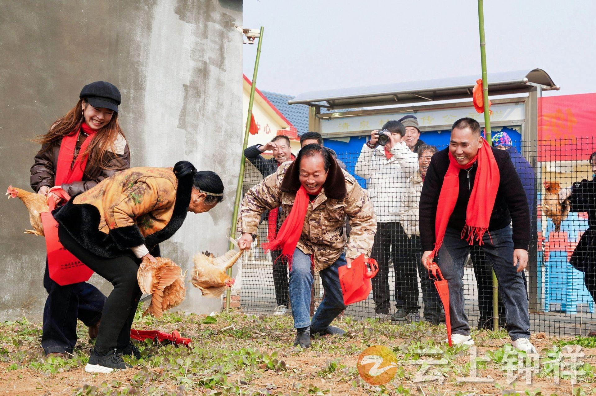 上午10点多,一曲激昂澎湃的《欢聚一堂威风锣鼓》拉开了活动的序幕,铿锵的鼓点瞬间点燃了现场气氛。冷水镇党委相关负责人热情欢迎游子归家,并介绍了家乡一年来的新变化,钟祥邮政公司负责人则送上“人民邮政为人民”的暖心承诺。随后,歌曲《祝福祖国》、独舞《人间烟火》、舞蹈《花开中国》、《福到咱家》等由村民自编自演的节目轮番上演,同步开展的一系列充满乡土气息和年味的趣味活动将现场变成了欢乐的海洋。“估膘”环节,十份新鲜猪肉一字排开,乡亲们凭经验眼力竞猜重量,最接近者喜提猪肉年礼;“谁是真正的领头羊”游戏趣味十足,几位党支部书记同台竞技,在指定区域内徒手抓捕山羊;“鸡不可失”抓鸡游戏更是将气氛推向高潮,抓到“战利品”的村民喜笑颜开。