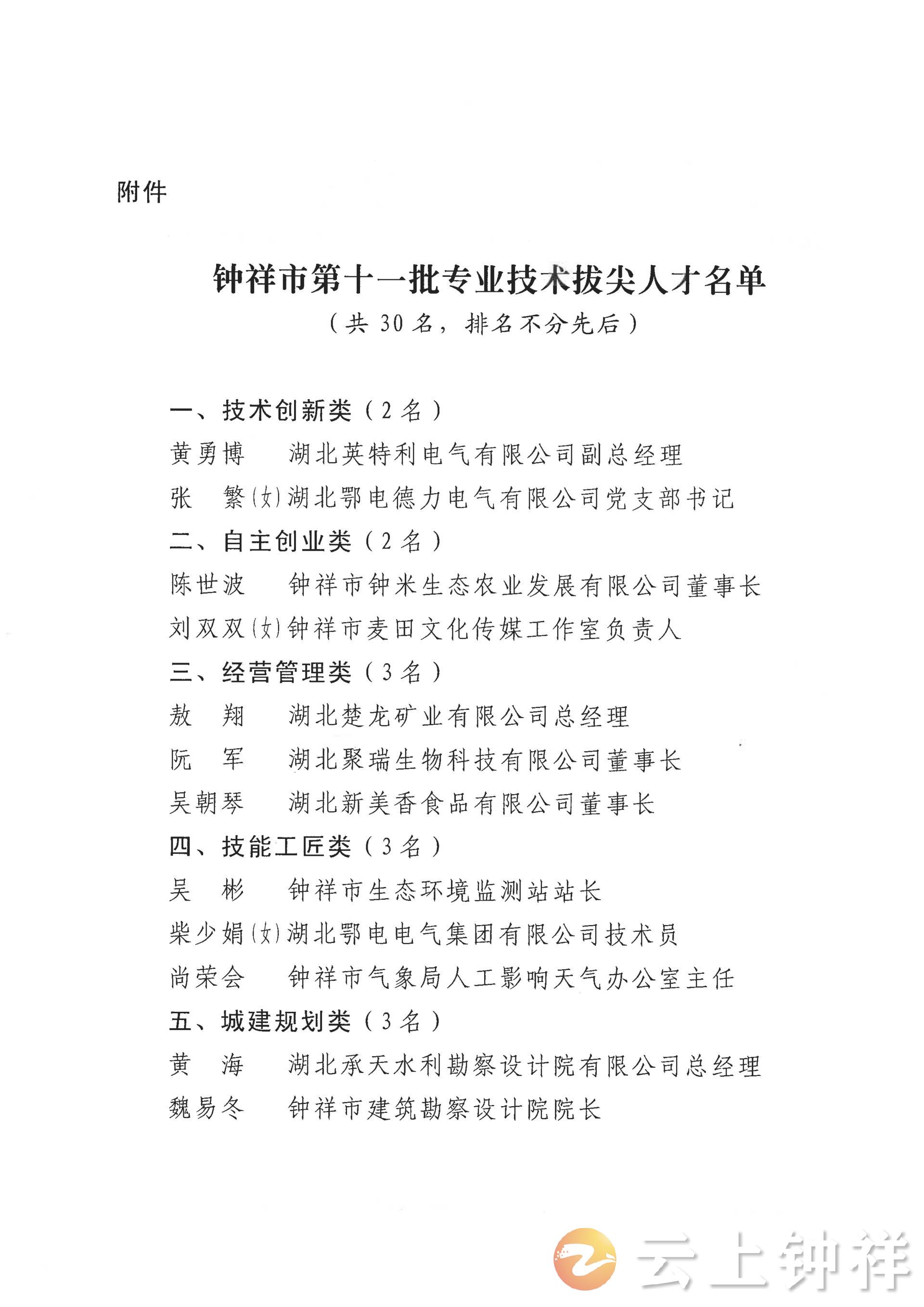 1月23日,钟祥市委办公室、市政府办公室联合发布通知,公布了钟祥市第十一批专业技术拔尖人才名单,湖北英特利电气有限公司副总经理黄勇博、市人民医院心血管内科Ⅱ主任陈晓云等30名行业精英成功入选。