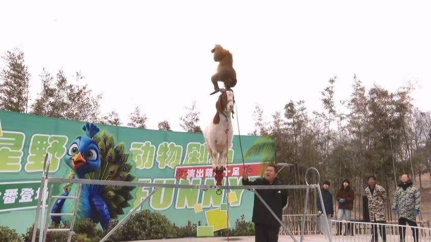 斗鸡过后就是羊背猴表演。当工作人员牵着山羊走上舞台后,一只猕猴小淘气突然一下就爬到了山羊背上。之后山羊背着小猴稳稳地爬上铁梯,走过不足十公分的“独木桥”,然后回到独木桥中间,四条羊腿站在直径十多厘米的圆盘上,小心地移动四蹄转圈。而这时羊背上的小猴则玩起了花样动作,还用前爪握住羊角倒立。这样的表演,需要两个动物有百分之百的信任和默契,山羊的稳定如山,猴子的灵活如风,它们组合在一起,就是最完美的丛林生存示范,也向我们展示了动物世界有趣的共生与协作。