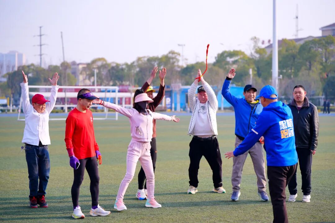 操场上,又一对搭档做好准备即将起跑。细绳微微绷直,脚步坚定迈出。
