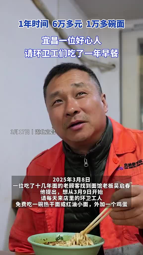 去年3月8日,一位吃了十几年面的老顾客找到吴启春。他提出,想从3月9日开始,请每天来店里的环卫工人免费吃一碗热干面或红油小面,外加一个鸡蛋。