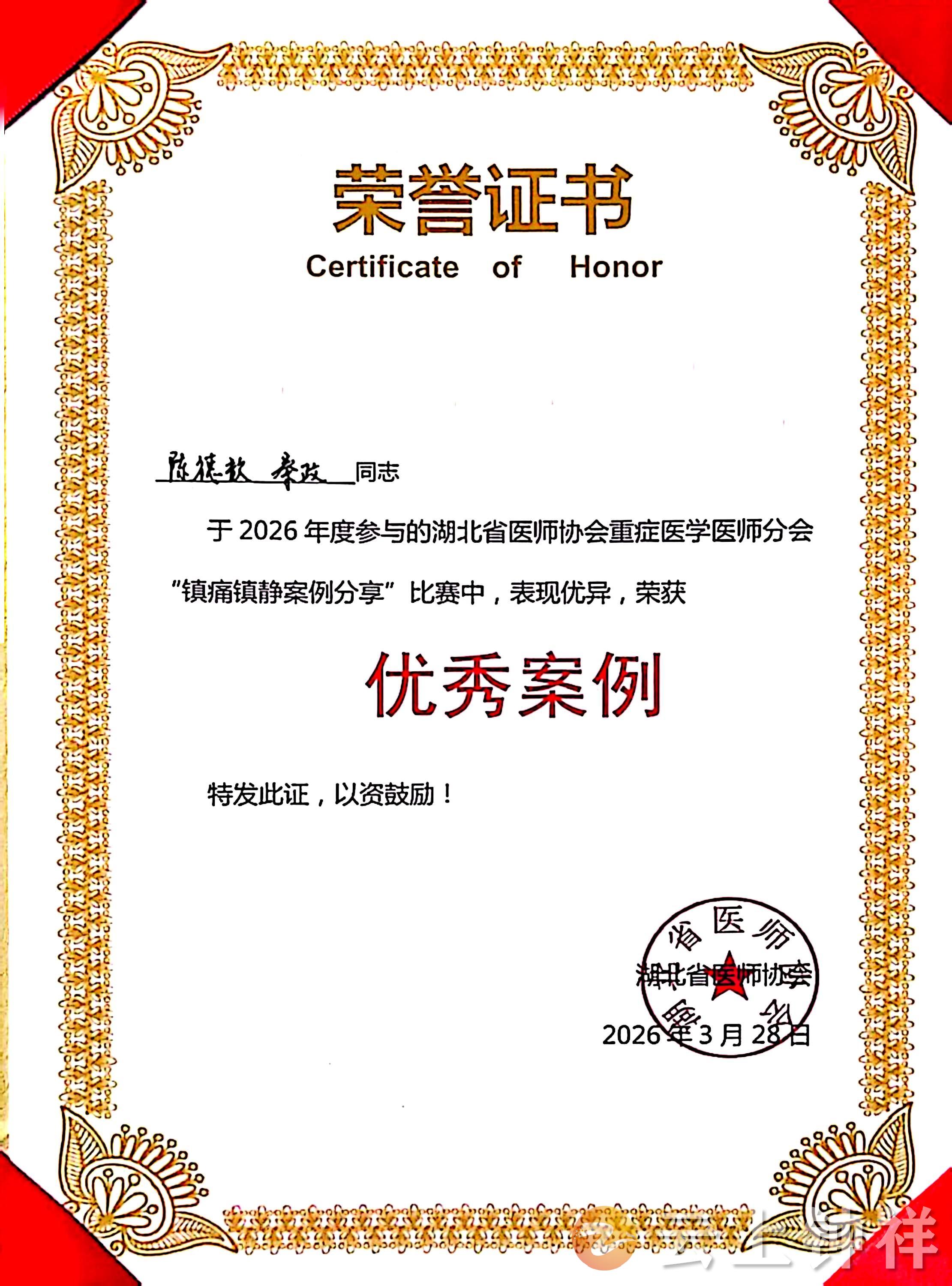 近日,由湖北省医师协会主办的2026年重症医学医师分会学术会议暨镇痛镇静护理案例展示赛在武汉圆满落幕。钟祥市人民医院重症医学科凭借扎实的临床实践与创新的护理方案,成功斩获“优秀案例奖”,充分彰显了科室在重症镇痛镇静护理领域的专业实力与学术水平。