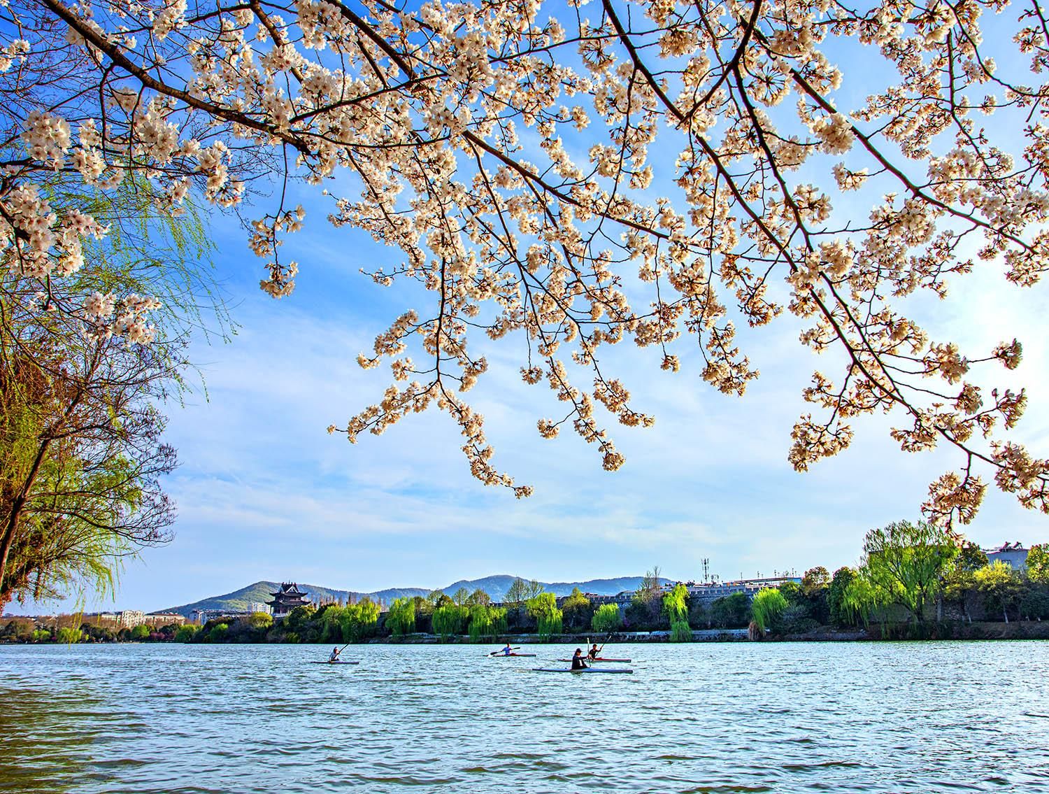 此刻,游人们正寻景打卡,皮划艇在春水上轻荡,这些瞬间都成了郭连华镜头里的点睛之笔。他说,一朵花、一枝柳、一叶舟,都是春日襄阳的鲜活点缀,让古城的春意更有温度。