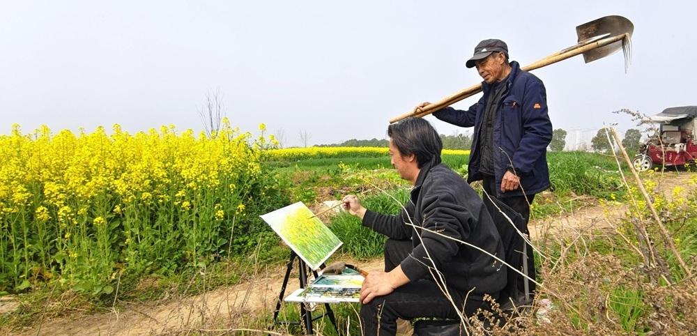 “这样鲜活的场景,是我们写生最想留住的。”“周二写生组”组长曹绍军说。他们通常在每周二相约户外写生,以画笔记录古城文脉、汉江风情和城乡变化。画家胡梦婷特意在盛放的油菜花旁绘下一株枯树:“春天万物更迭,既有落幕,又有新生,这才是生命最真实的状态。”