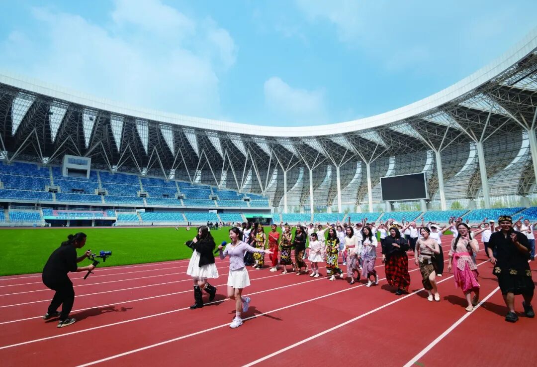 在黄石奥体中心,土豆片乐队和湖北理工学院留学生同乐合唱团、黄石歌飞扬合唱团近百人,共同录制最新创作的新歌《城市荣光》MV,为楚超加油。 石勇/摄