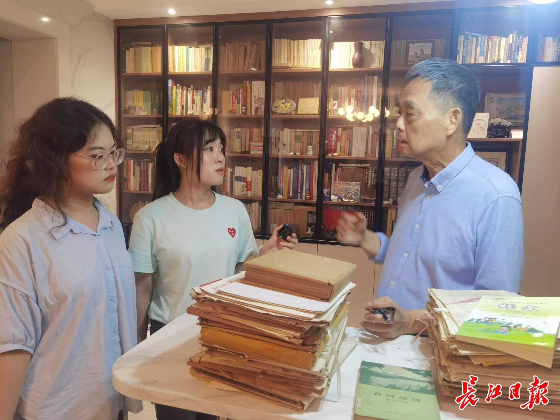 两名女大学生仔细打量着藏书。这时,邱如莹的眼神突然亮了:“我们在台湾找到过这本书!”