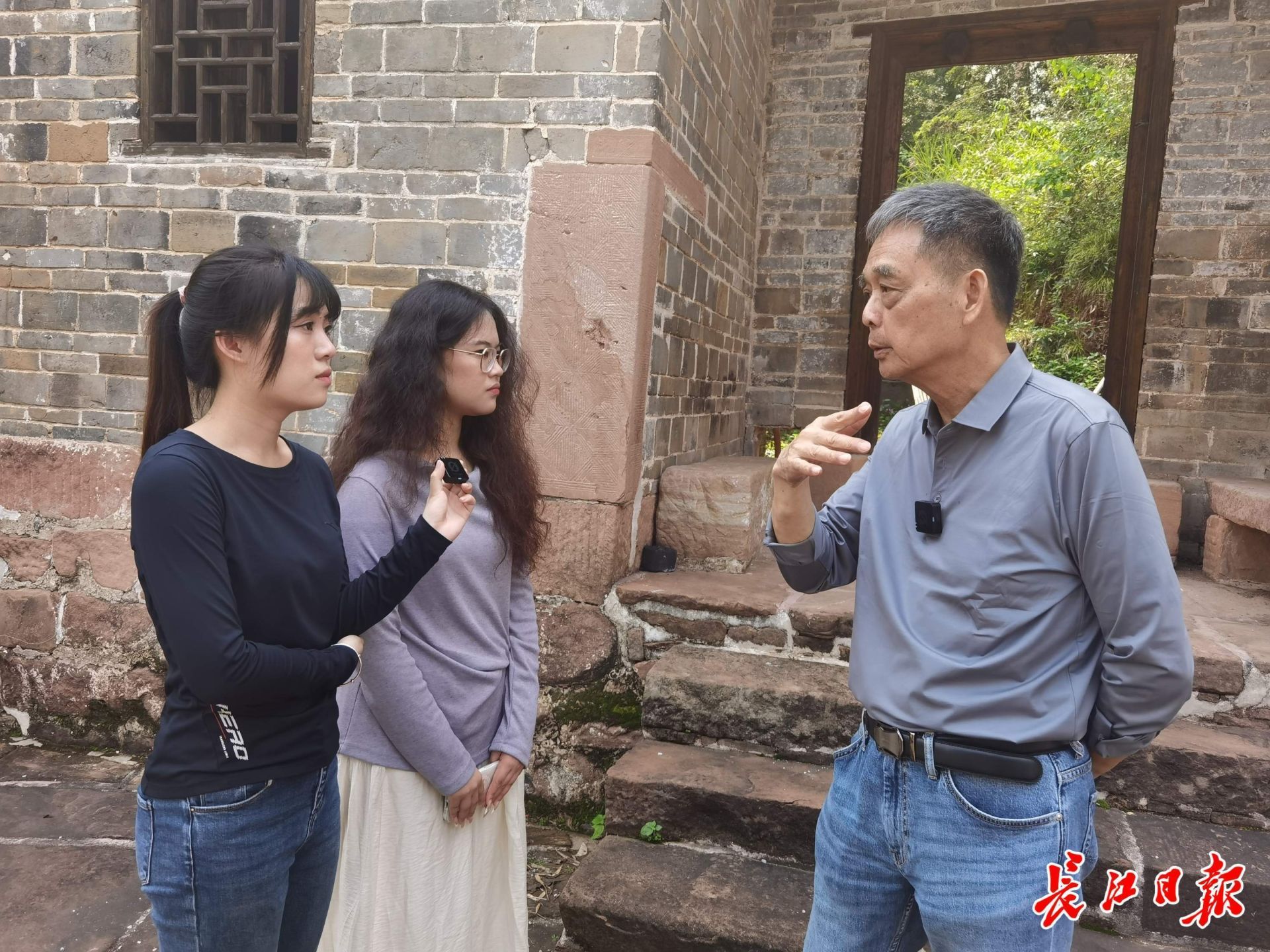 在中山大学坪石旧址,吴杰明(右一)向两名台湾女生讲述父亲在坪石的工作经历。记者杨佳峰 摄