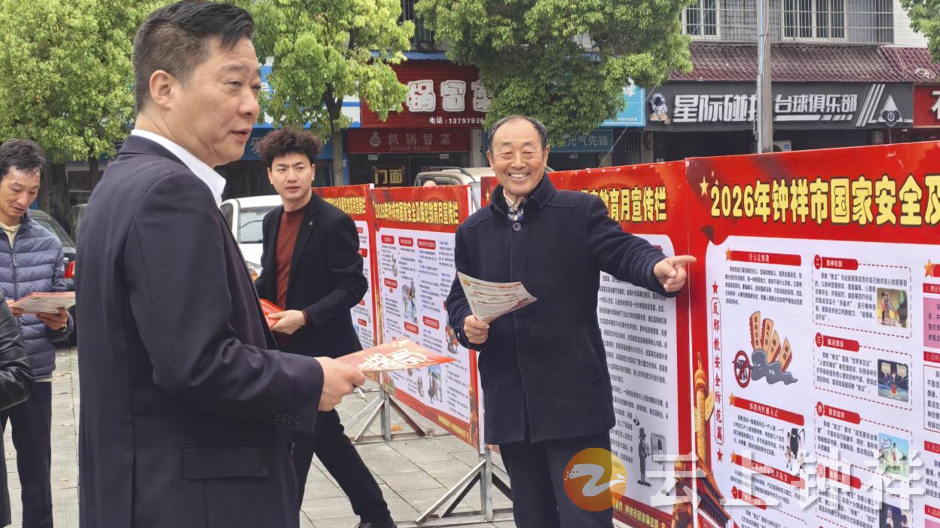 4月14日,钟祥市国家安全及保密教育月宣传活动走进石牌镇,在该镇文化广场顺利开展,借助集市人流密集优势,向群众普及国家安全知识。