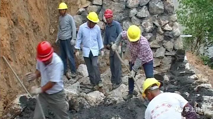 挡土墙是整个治理工程中最为重要的一环,具有严格的标准。工人们在施工时,将水泥和砂按比例进行混合调配,用于石头之间进行固定,修建好的挡土墙为梯形,其底宽为3.75米,顶宽2米,高度7米,可最大程度防止滑坡。