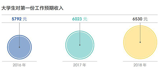 调查显示,大学生对第一份工作收入的预期呈现逐年攀升的趋势,2018年收入预期为6530元,相比去年增加了507元。同时,大学生对第一份工作收入增幅的预期也在逐年快速增长,今年增幅预期为8%,而这一数字去年为4%。