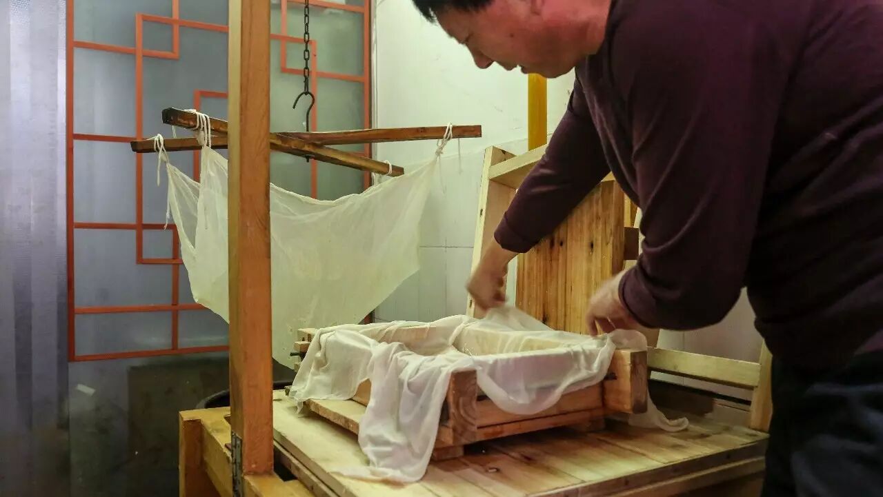 石牌豆腐坊的千张里脊是小编从未见过的。老板亲自用石磨磨黄豆,制作成豆腐皮后,包裹起里脊肉,再用秧田的草左右一捆。